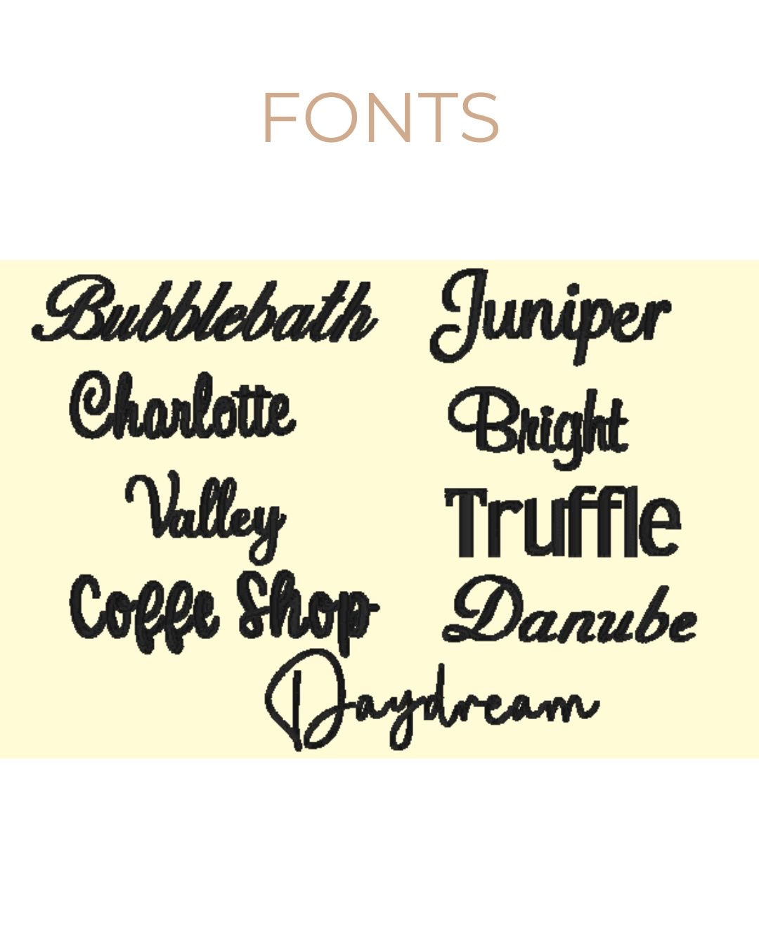 A variety of font styles are available! In the text box, please enter the name you'd like to personalize your piece.
